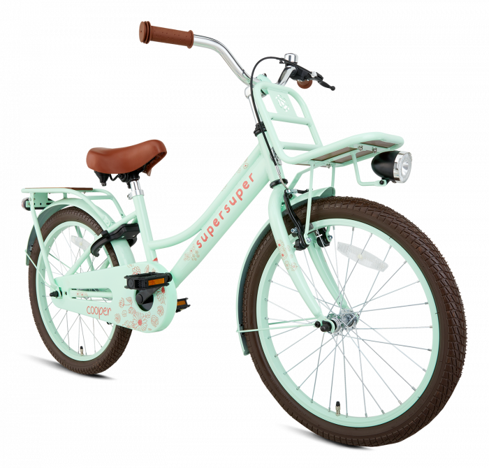 De Supersuper Cooper Bamboo is een variant op de Transportfiets. Met handig voorrek voor en solide bagagedrager achterop kan de eigenaar van deze mooie Meisjesfiets van alles meenemen, zoals bijvoorbeeld de schooltas. De Cooper Bamboo Meisjesfiets van Supersuper is uitgerust met V-brake voor en terugtraprem achter, zodat voor iedere situatie een geschikte rem bestaat. De 20 inch Meisjesfiets van Supersuper wordt geleverd met zijstandaard en met ringslot, zodat de Cooper Bamboo altijd snel en veilig op slot gezet kan worden. Verder verhogen de reflectoren op de band de zichtbaarheid van de bestuurder bij weinig licht. Tenslotte is de LED verlichting voor en achter echt onmisbaar voor fietsen in het donker. De Supersuper Cooper Bamboo Meisjesfiets 20 inch de ideale fiets voor kinderen die graag op een mooie fiets gezien willen worden en genoeg ruimte willen hebben om al hun spullen mee te nemen!